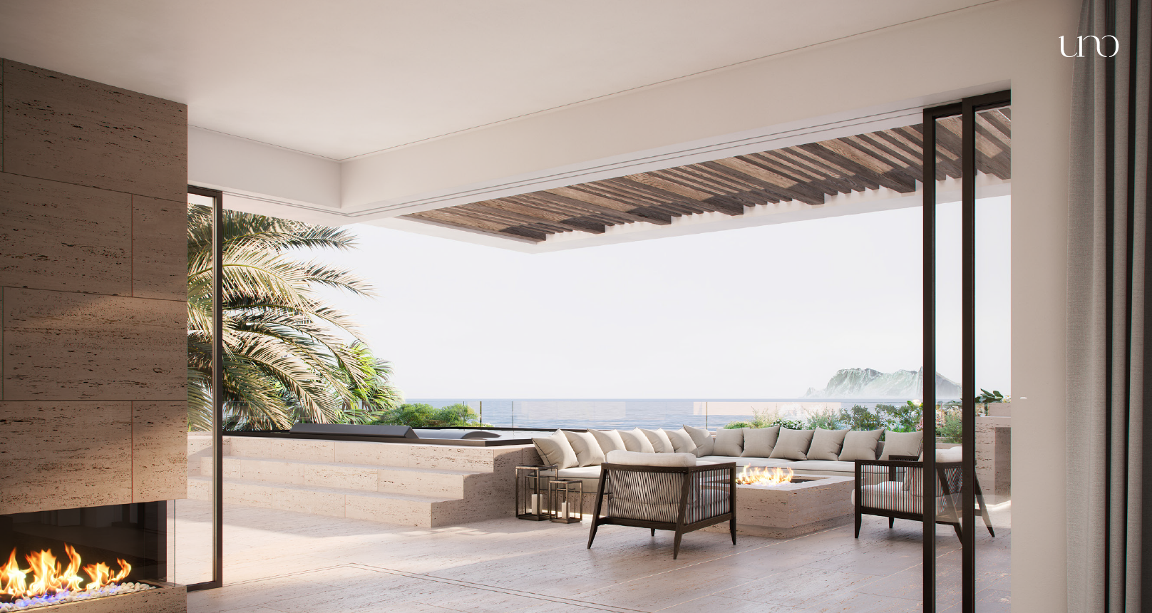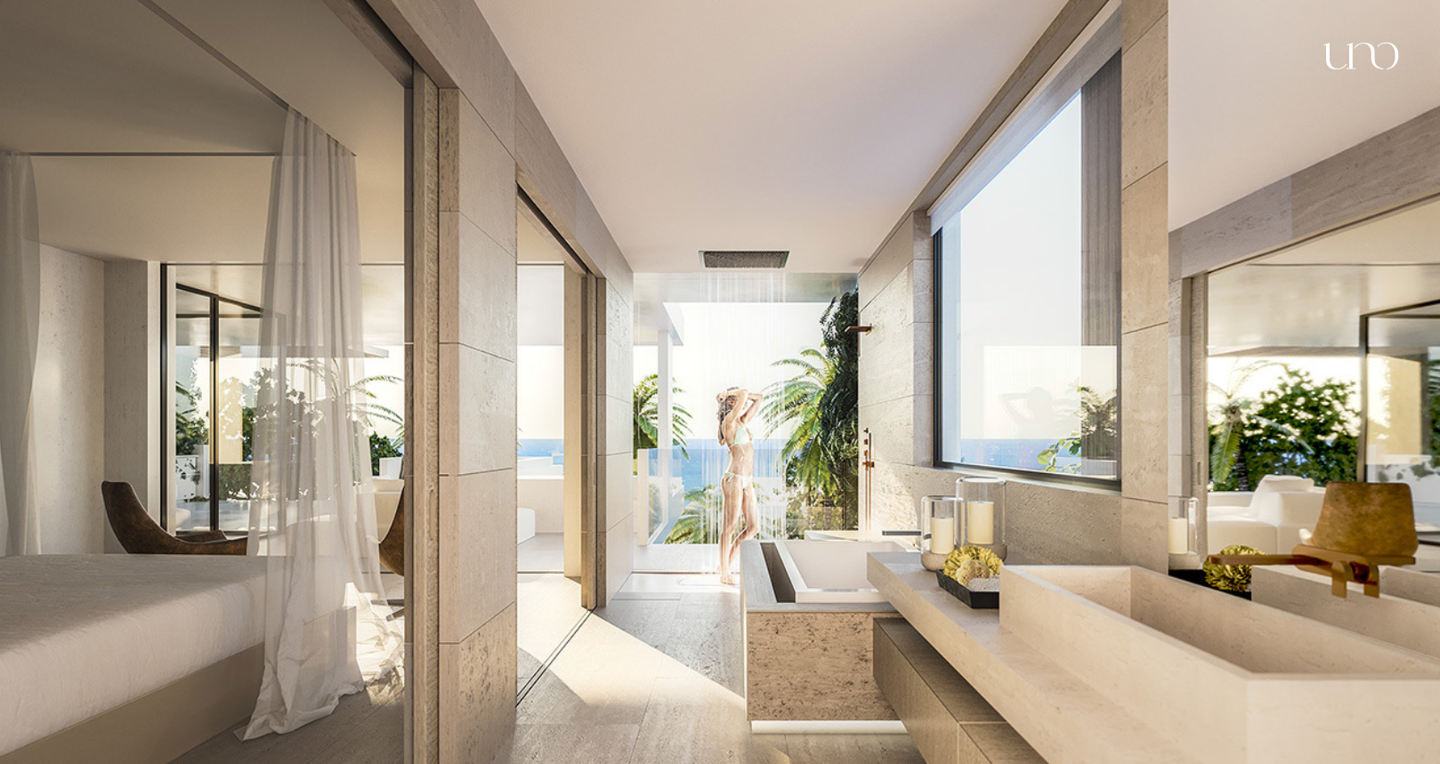 The residences comprise approximately 50 ultra-luxury apartments—ranging from two-bedroom units with offices to grand six-bedroom penthouses—together with four exclusive villas. Each residence is equipped with open-plan living areas, floor-to-ceiling glazing, heated bathroom floors, and generous terraces designed for Mediterranean living.